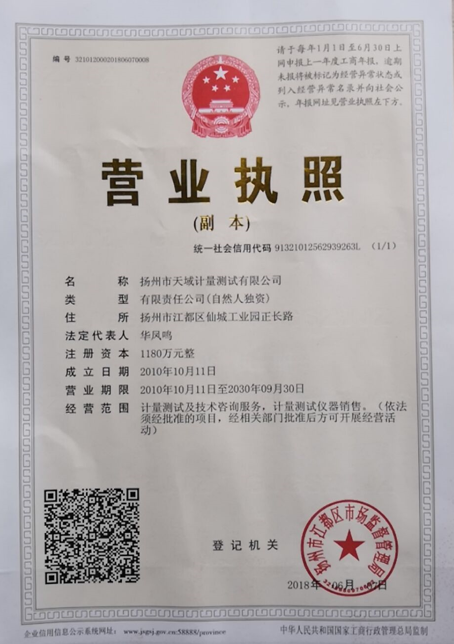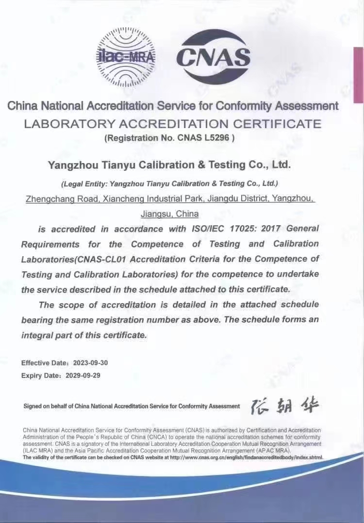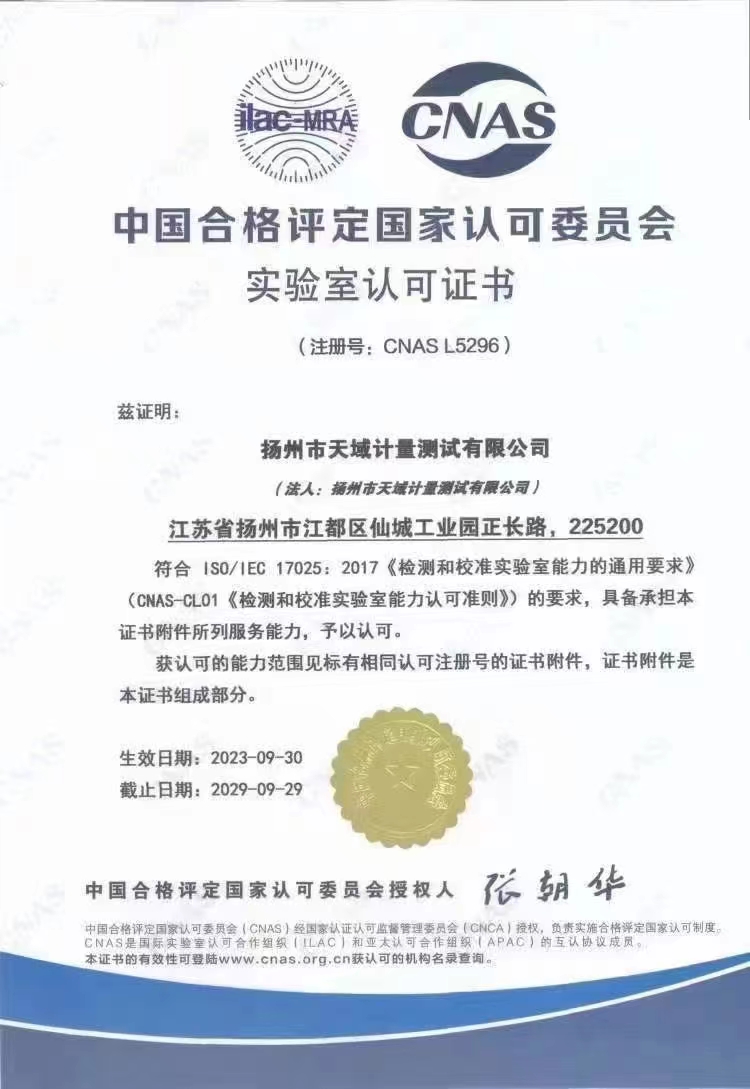 揚州市天域計量測試有限公司,坐落在交通便利的揚州市江都區(qū)仙城工業(yè)園,成立于2010年10月,2011年11月正式獲取中國合格評定國家認可委員會認可(授權),注冊號:CNAS L5296。近幾年的發(fā)展,實驗室已具備了較大規(guī)模,并形成了集計量器具檢測,計量技術咨詢和計量器具銷售為一體的專業(yè)化技術機構,客戶覆蓋蘇南、蘇北、和浙江,安徽部分地區(qū),客戶群總量達到了上千家企事業(yè)單位。實驗室建立健全了一套較為完整的內(nèi)外部質量管理體系,至今未發(fā)生糾紛和客戶投訴事件。